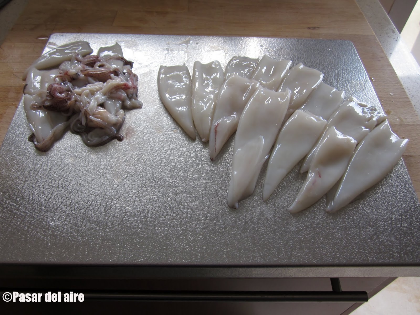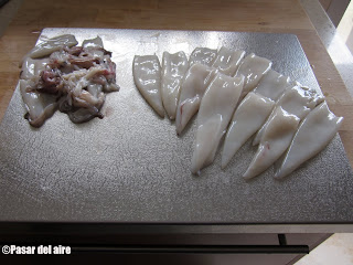 - Limpiar los chipirones. Separar las patas y dejar los cuerpos no tarados para rellenar. Las patas y los cuerpos pequeños o rotos, trocear pequeño junto con los mejillones.