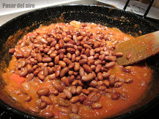 - Cuando esto está ya un poco más espeso, ponemos las alubias. Como ya están cocidas, no necesitan mucho rato. En 5 o 10 minutos, listo.