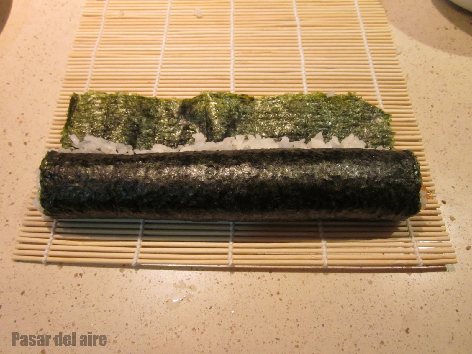 - Cuando tengáis cierta práctica en el esparcido del arroz, cortad la hoja de nori en dos partes, a lo largo. Se reparte, dejando la pestaña y al enrollar deben coincidir el principio y el final del arroz, quedando la pestaña para el cierre. Al principio cuesta un poco no quedarse corto al enrollar por exceso de relleno o haber puesto demasiado arroz. Empezad con estos y cuando estéis sueltos, a por el más pequeño. Recordad que al cortarlo deberéis dejarlos más altos (cortados en cuartos).
