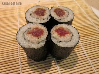 Quizás el más conocido. Rollitos de un bocado, envueltos con alga nori, sumeshi y relleno. En este caso, he usado sake (salmón) y maguro (atún). Se ha utilizado salmón ahumado (para los usarios más reticentes) y atún fresco ligeramente marinado en salsa teriyaki. Para facilitar la elaboración, sobre todo si sois primerizos, os indico cómo hacer los rollos un poquito más gordos de lo debido. Si ya tenéis experiencia, pasad primero a las indicaciones, que os pone cómo hacerlos más finos. Aunque, si tenéis más experiencia, igual tampoco necesitáis todo esto.