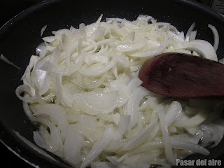 - En abundante aceite de oliva (no seáis rácanos), rehogamos la cebolla con un poco de sal, cortada en juliana.