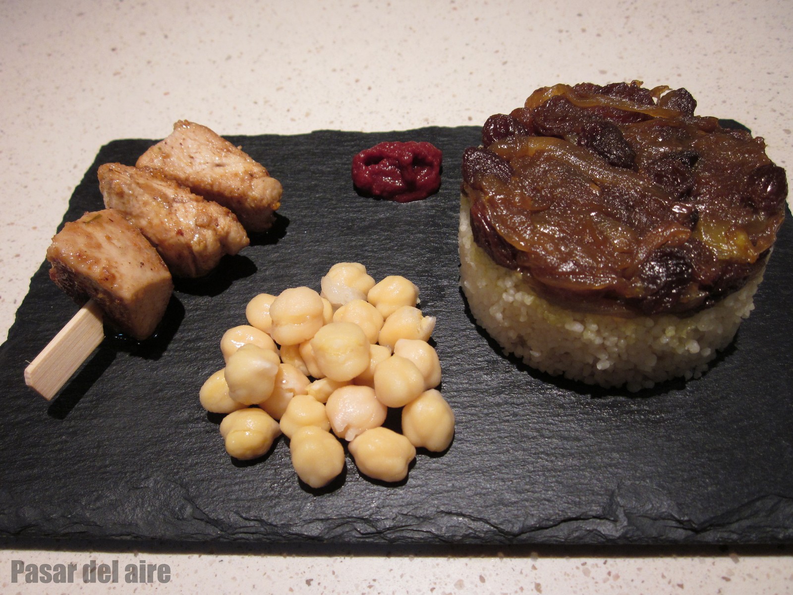 Esta elaboración no es ni mucho menos la original, ni pretende ser un cuscús genuino. Es tan sólo una forma de acompañar los pinchos con la sémola… o de acompañar la sémola con unos pinchos… no sé qué acompaña a qué.