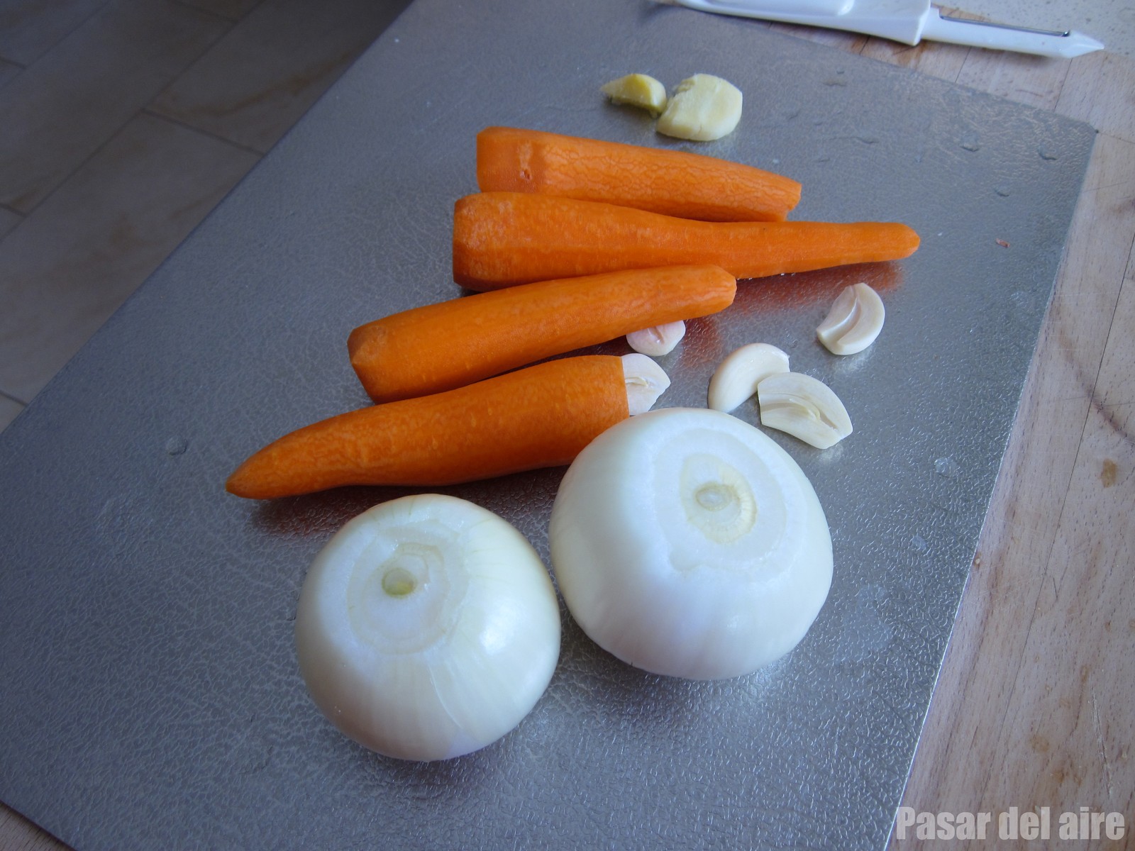 En el mismo aceite (poner un poco más si ha quedado poco), sofreir la cebolla, la zanahoria y los ajos cortados al gusto. Rallar un poco de jengibre en el sofrito.