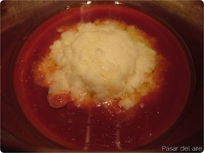 - Poner el aceite en una olla, cuando esté caliente añadir el tomate y la cebolla. Sofreír durante unos 10 minutos removiendo de vez en cuando.