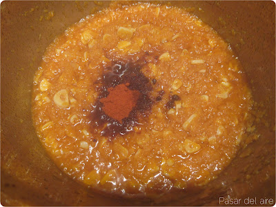 - Agregar el ajo y remover. Cuando el ajo se pueda cortar fácilmente añadir el pimentón, dejándolo sofreír ligeramente.