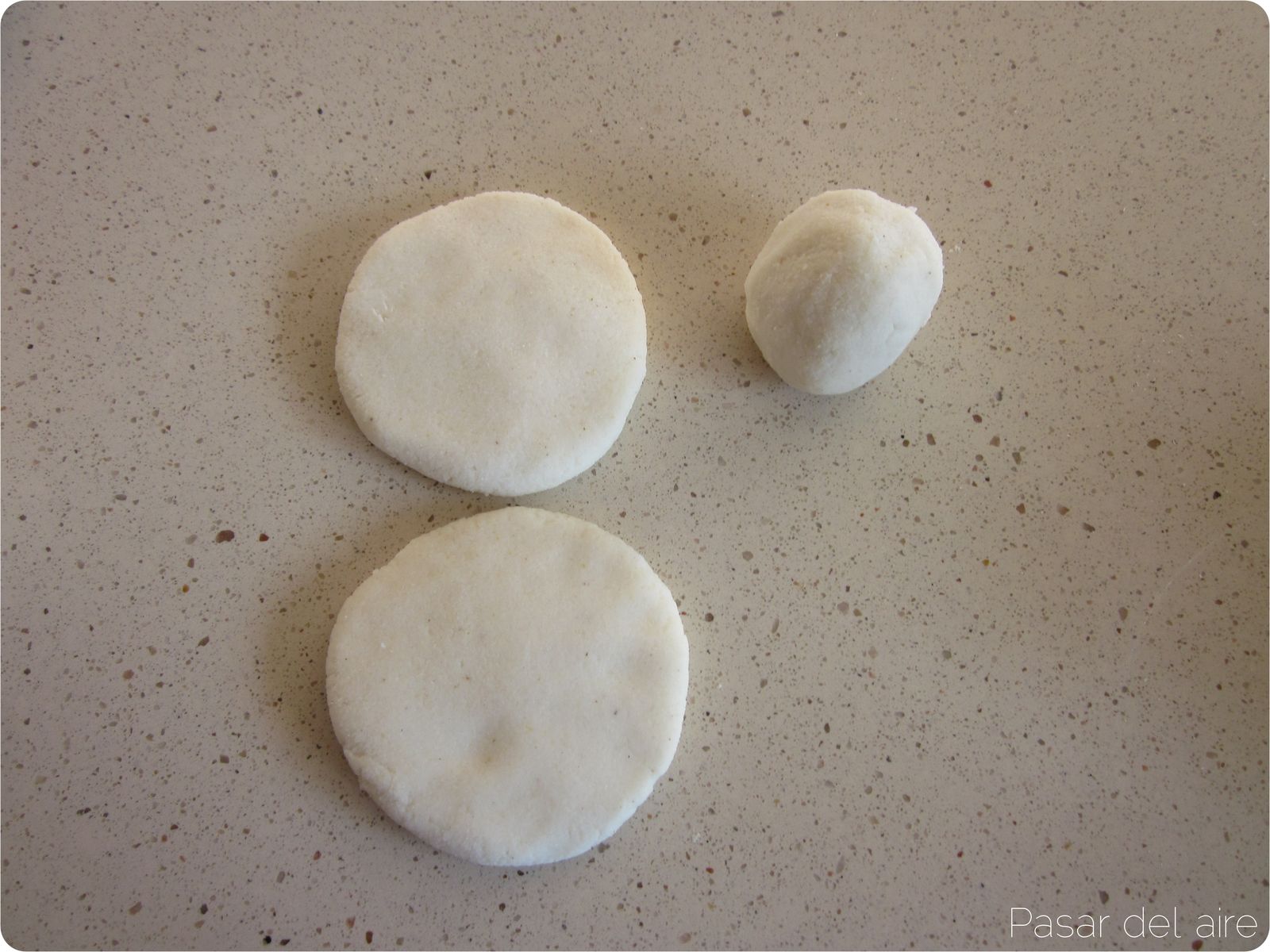 Dividir la masa en 6 partes y hacer bolas, aplanarlas con suavidad y redondear los bordes, el tamaño será como el de un platillo de café, más o menos. Se pueden hacer más finas o más gruesas, eso depene del gusto del consumidor.