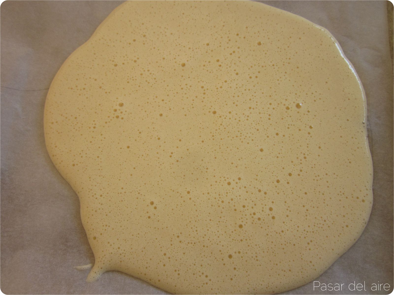 Cubrir una bandeja de horno con papel de hornear, con la marca de lápiz en la parte de abajo, y verter la preparción, procurando que quede bien extendida y que cubra la parte marcada.