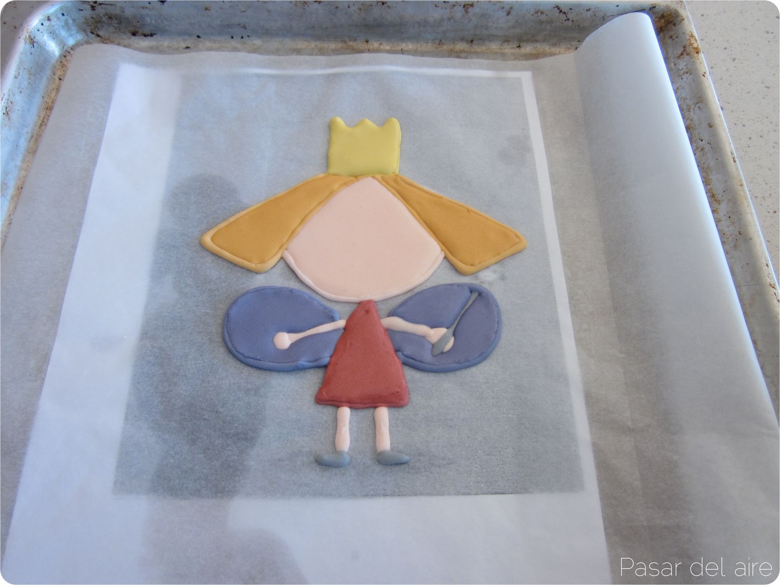 Rellenar el dibujo con la misma glasa pero clarificada con unas gotas de agua. Hay que poner bastante relleno porque al secarse pierde volumen.