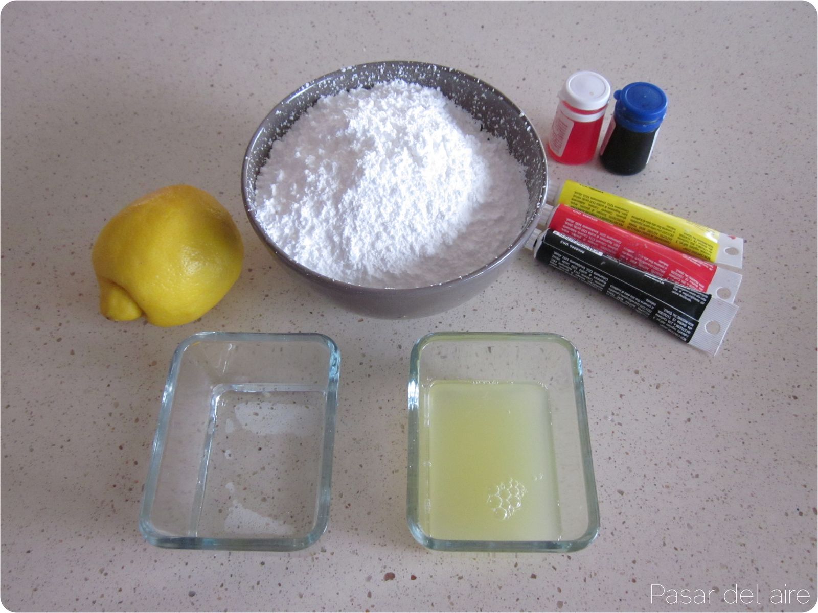 Tapar bien porque se seca muy rápido. Hacer las mezclas con los colorantes y poner en manga pastelera o en bolsa de congelado a la que se puede cortar la punta.