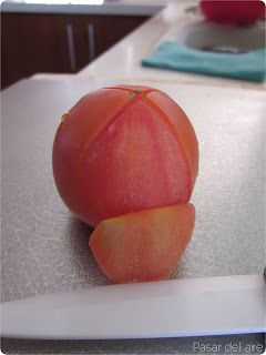 - Con la ayuda de un cuchillo y tirando de la piel en los cortes que hemos hecho con antelación, pelar los tomates.